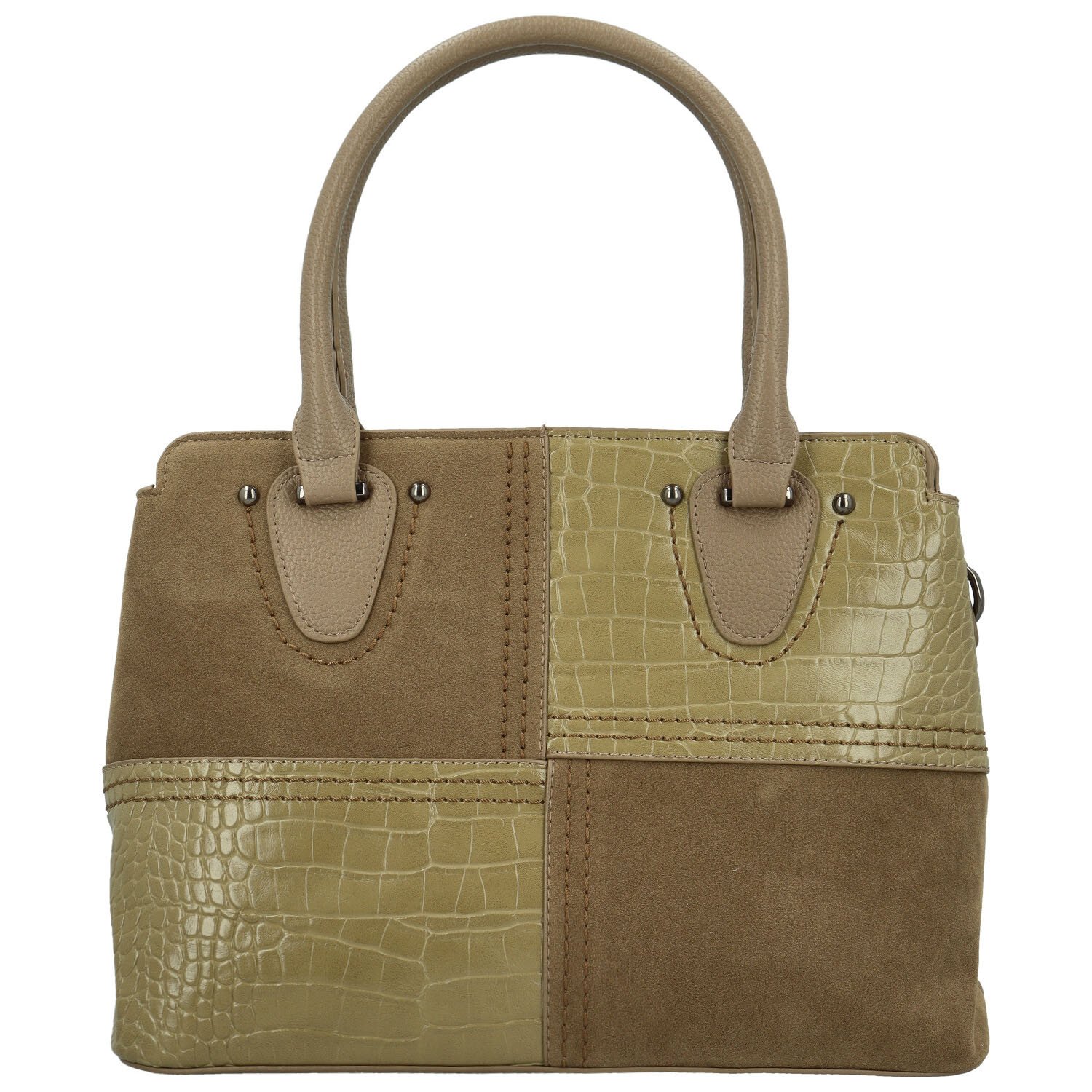 Přední část je rozdělena do obdélníků, přičemž šikmé protilehlé díly jsou vyrobeny z odlišných struktur - semišové koženky a hadího vzoru. Tento kontrast vytváří zajímavý a moderní vzhled. Zadní strana je naopak hladká a doplněná o praktickou kapsičku na zip.