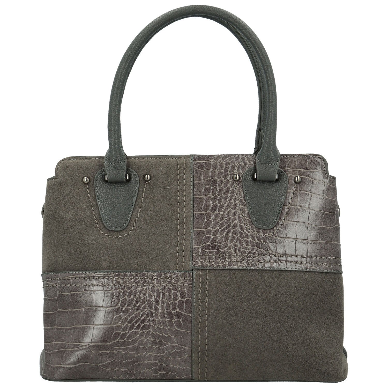 Přední část je rozdělena do obdélníků, přičemž šikmé protilehlé díly jsou vyrobeny z odlišných struktur - semišové koženky a hadího vzoru. Tento kontrast vytváří zajímavý a moderní vzhled. Zadní strana je naopak hladká a doplněná o praktickou kapsičku na zip.