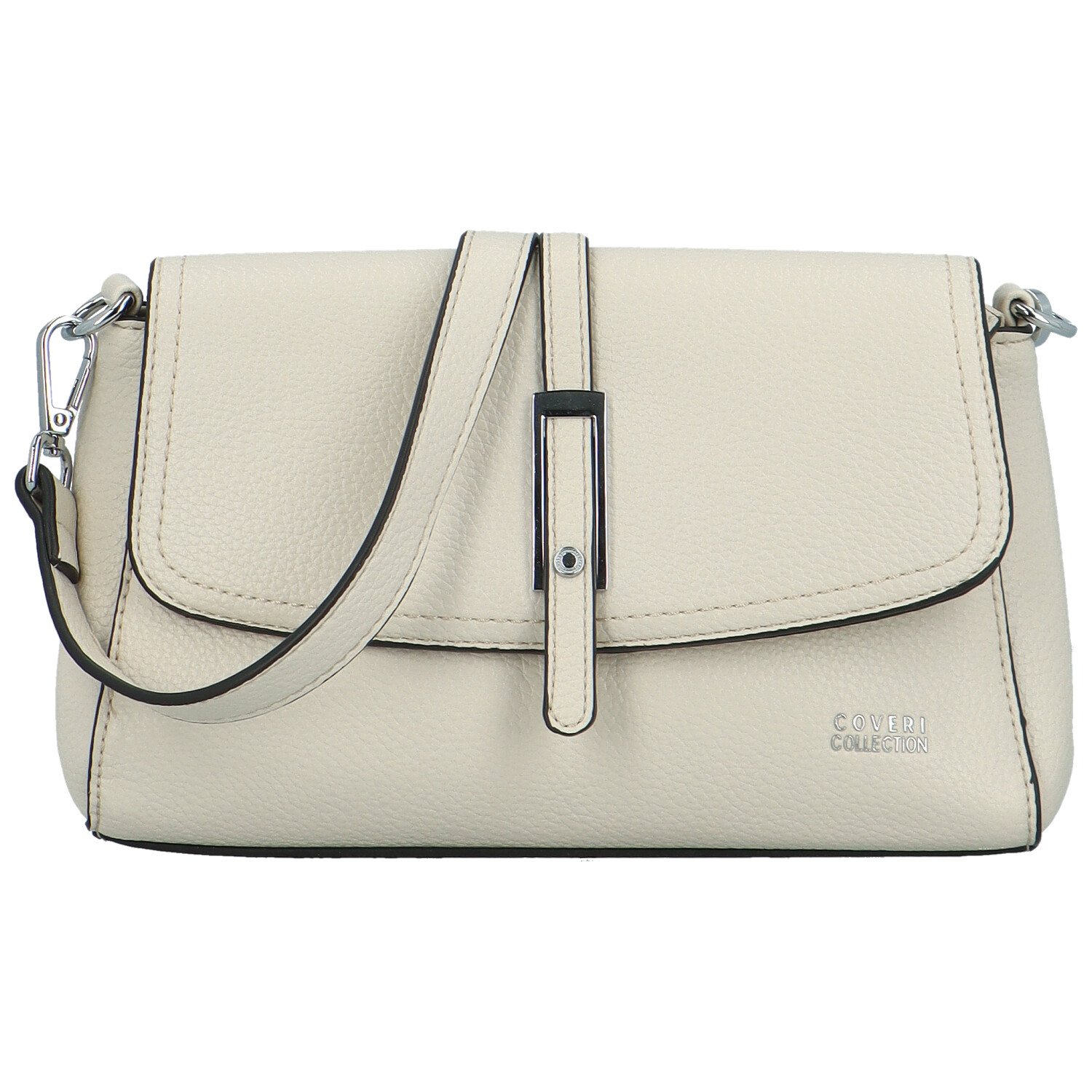 Tato kráska je ušitá z velmi příjemné a kvalitní koženky. Černé lemování a jemné prošití kabelce velmi sluší. Přední strana je zdobená klopou s jemným okrasným proužkem a stříbrnou sponou. Po otevření klopy se nabízí hlavní kapsa na zip s menšími kapsičkami uvnitř.
