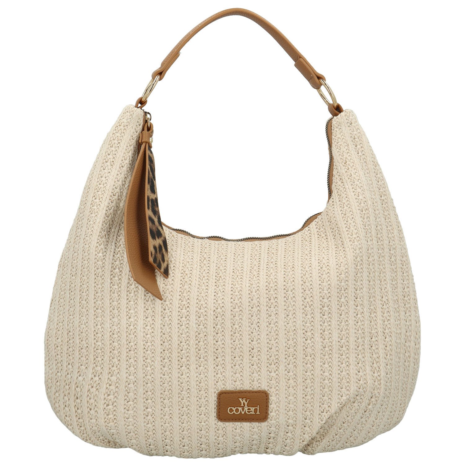 Povrch kabelky zdobí jemný pruhovaný vzor, který ji dodává strukturu a originalitu. Dominantním prvkem je krátké ucho z koženky s kovovými kroužky, díky kterému lze kabelku pohodlně nosit na rameni.