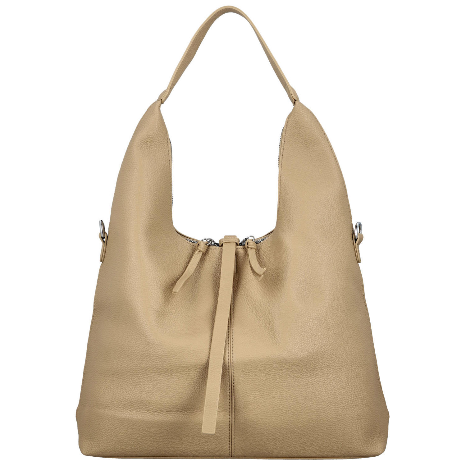Hlavní kapsa je zajištěna dvěma zipy a uprostřed ji efektně i prakticky doplňuje koženkový proužek, který se přetahuje přes horní část kabelky a podtrhuje její originální vzhled. Uvnitř najdete přehledně řešený prostor - kapsičky v podšívce pro drobnosti a středovou zipovou kapsu pro bezpečné uložení cenností.