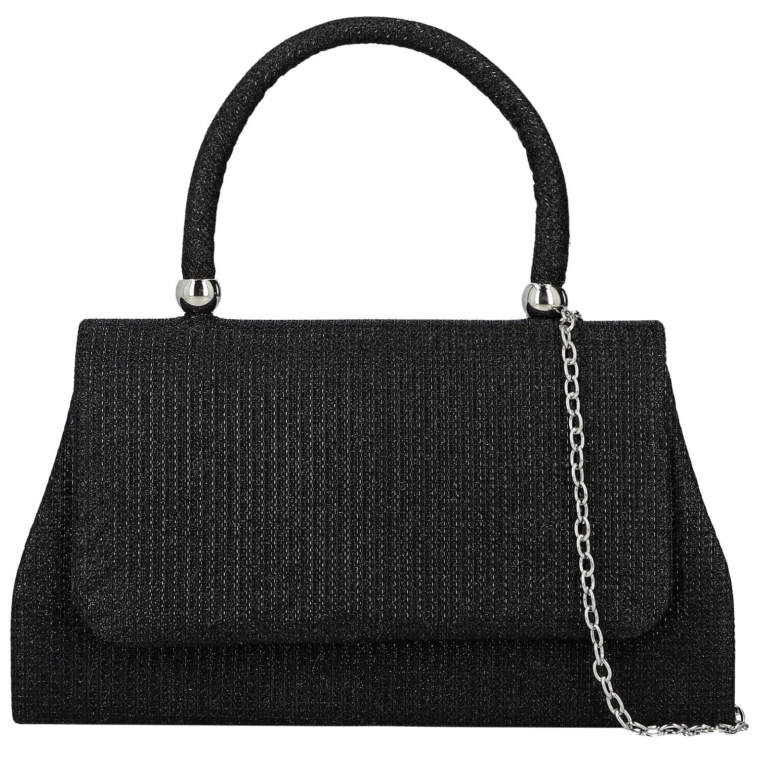 Kabelka má rovně zakončenou klopu, což podtrhuje její čistý, moderní vzhled. Pro pohodlné nošení v ruce je vybaven pevným uchem, jehož konce zdobí dekorativní kovové kroužky - elegantní detail, který doplňuje její slavnostní charakter.