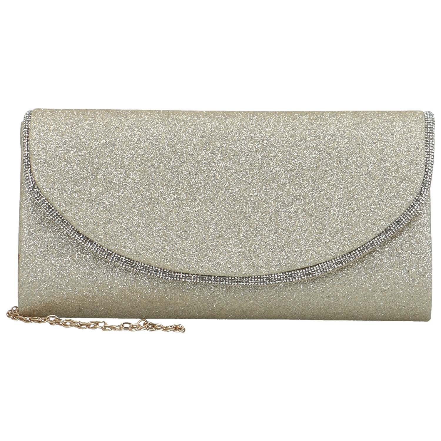 Kabelka je v pevném provedení a je potažená třpytivou látkou. Klopa je zakulacená a zdobí ji jemný proužek s mini kamínků. Po otevření nabízí prostor je pro to nejdůležitější.