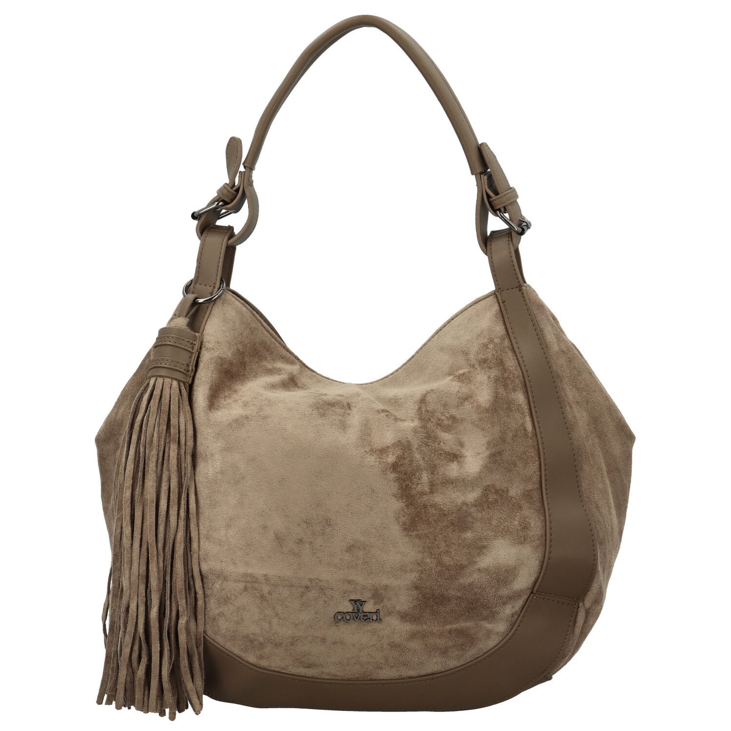 Jemný semišový povrch doplňují koženkové prvky - pevné ucho a zaoblené pruhy na přední i zadní straně, které dodávají kabelce šmrnc i pevnější tvar. Přední část zdobí výrazný semišový střapec, jenž kabelce propůjčuje elegantně hravý detail.