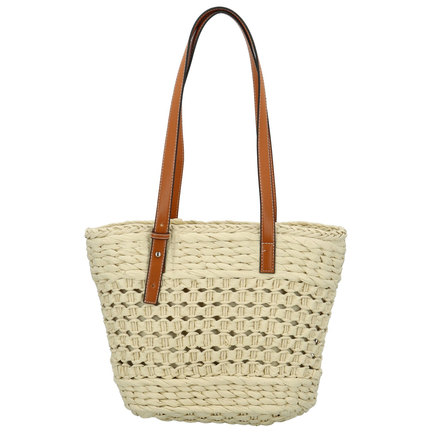 Jsou z kontrastní hnědé koženky a dodávají kabelce ten správný šmrnc. Design kabelky je pletený z lýkové slámy, působí vzdušně a tak je vhodná především pro letní dny.
