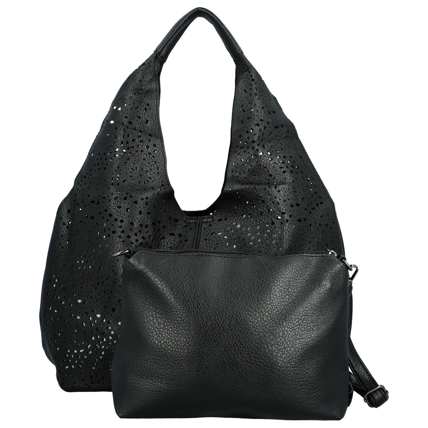 Větší kabelka je designově děrovaná a má velmi módní lodičkový střih. Hlavní kapsu zabezpečíte zipem. Menší kabelka je měkčí a uvnitř jsou k dispozici přihrádky na Vaše drobnější věci. Ke kabelce je přídavný popruh s možností regulace délky, pro nošení na rameni.