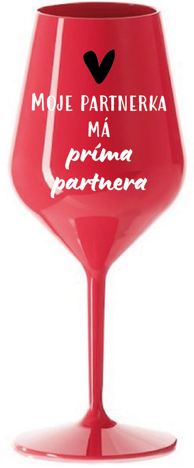 Nerozbitná červená vinná sklenice s motivem MOJE PARTNERKA MÁ PRÍMA PARTNERA je skvělá na zahradu, pláž, výlet, piknik a parádu udělá i při kempování. Jelikož je vyrobená z kvalitního polykarbonátu je de facto nerozbitná. Je to luxusní kousek, s nímž si víno můžete vychutnat prostě kdekoliv. Mají ergonomický tvar, který příjemně padne do ruky a protože je lehká, usnadňuje to její přenášení. Je snadno skladovatelná a lehce se čistí. Díky svému designu si s ní můžete vychutnat doopravdy kdekoliv bezproblémové pití výborného vína. Materiál PP. Vyrobené s láskou v ČR