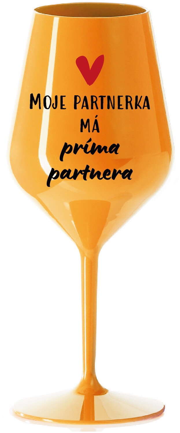 Nerozbitná oranžová vinná sklenice s motivem MOJE PARTNERKA MÁ PRÍMA PARTNERA je skvělá na zahradu, pláž, výlet, piknik a parádu udělá i při kempování. Jelikož je vyrobená z kvalitního polykarbonátu je de facto nerozbitná. Je to luxusní kousek, s nímž si víno můžete vychutnat prostě kdekoliv. Mají ergonomický tvar, který příjemně padne do ruky a protože je lehká, usnadňuje to její přenášení. Je snadno skladovatelná a lehce se čistí. Díky svému designu si s ní můžete vychutnat doopravdy kdekoliv bezproblémové pití výborného vína. Materiál PP. Vyrobené s láskou v ČR