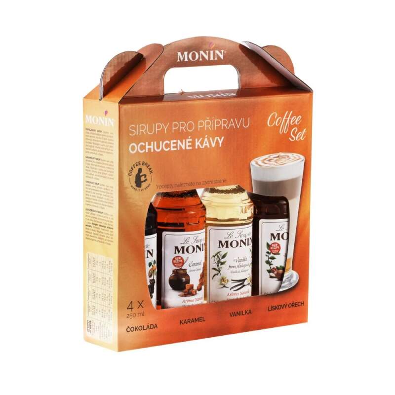 Monin box 4x0,25l Coffee Představujeme vám dokonalý dárek pro všechny milovníky kávy: exkluzivní sada základních příchutí pro přípravu ochucených káv. Tento atraktivní dárkový balíček obsahuje čtyři oblíbené příchutě - čokoládu, vanilku, karamel a lískový oříšek, každou v praktické lahvi o objemu 0,25 l. Tyto sirupy MONIN jsou ideální pro ty, kteří si rádi užívají kávu s osobitým twistem: Čokoláda: Pro hluboký a bohatý čokoládový zážitek. Vanilka: Jemná a aromatická, dodává kávě sladký nádech. Karamel: Sladkost a hloubka, která osladí každý šálek. Lískový Oříšek: Obohacuje kávu o teplé a oříškové tóny. Složení: Čokoláda: Cukr, voda, přírodní kakaové aroma s dalšími přírodními aromaty, barvivo: E150a, kyselina: kyselina citrónová. Vanilka: Cukr, voda, přírodní vanilkové aroma, kyselina: kyselina citronová, přírodní aroma. Karamel: Cukr, voda, přírodní aroma, kyselina: kyselina citrónová, barvivo: E150a. Lískový oříšek: Cukr, voda, přírodní aroma lískových oříšků s dalšími přírodními aromaty, kyselina: kyselina citrónová, přírodní aroma, barvivo: E150a.