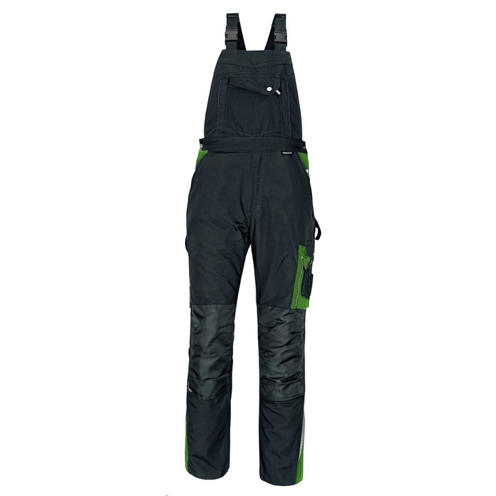 Kalhoty pánské ALLYN s laclem 280g/m2 zelené Materiál : 65 % polyester / 35 % bavlna,zesílení - DuPont Cordura - zesílená zdvojená kolena - celokovové zipy a druky - široké elastické kšandy - poutko na kladivo - reflexní doplňky 3M Velikost : 48 - 62 Kapsy na nákoleníky