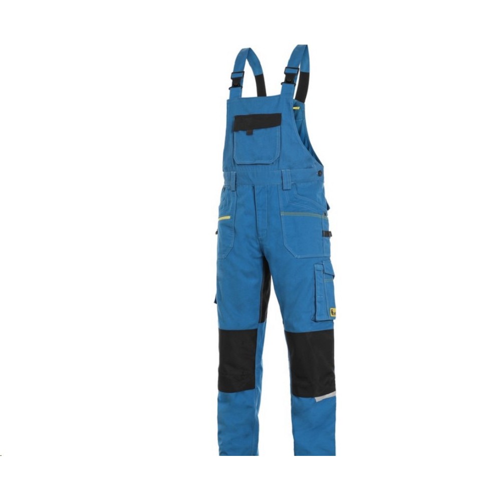 Montérkové kalhoty CXS STRETCH laclové pánské modro-černé Pánské montérkové kalhoty s náprsenkou, strečová tkanina umožňující volný pohyb, náprsní kapsa s klopou, pas s poutky na opasek, přední kapsy s kapsou na zip, multifunkční kapsy na obou stranách, kolena zesílena 600D polyesterem s možností vložení kolenních výztuh, dvě zadní kapsy jedna s klopou, zadní spodní lem nohavice vyztužen 600D polyesterem,šle s gumou vzadu, reflexní doplňky. Doporučené použití: strojírenství, stavebnictví, lehký průmysl, automobilový průmysl, logistika, skladová manipulace, spedice, autoservisy, údržba, montáže, zemědělství, zahrada, hobby. Základní Barva modro-černé Materiálové složení 98 % bavlna 2 % elastan Gramáž 250 g/m2 Normy EN ISO 13688 Velikost 46 - 64 Montérková kolekce CXS STRETCH Kategorie Kalhoty s laclem