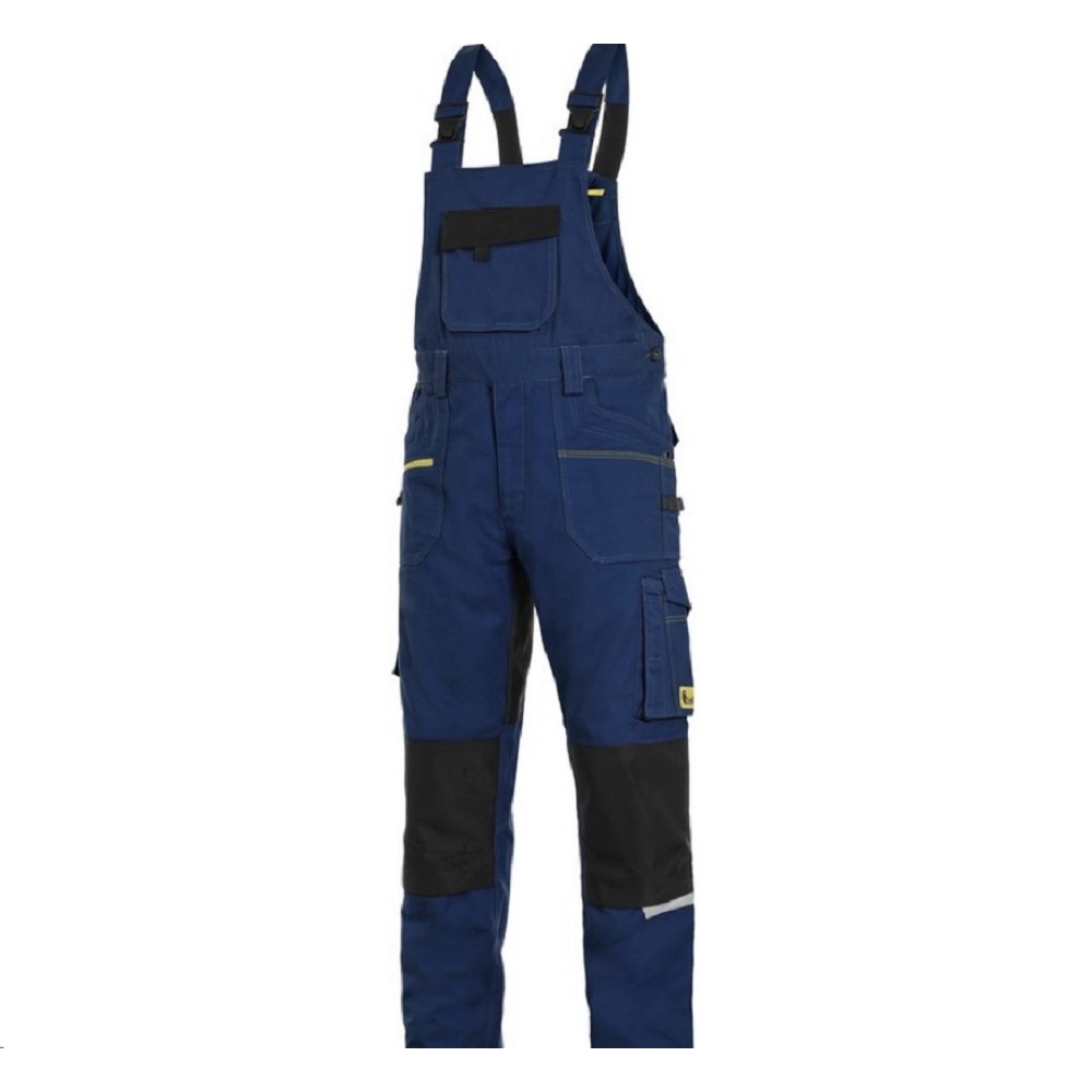 Montérkové kalhoty CXS STRETCH laclové pánské tmavě modré-černé Pánské montérkové kalhoty s náprsenkou, strečová tkanina umožňující volný pohyb, náprsní kapsa s klopou, pas s poutky na opasek, přední kapsy s kapsou na zip, multifunkční kapsy na obou stranách, kolena zesílena 600D polyesterem s možností vložení kolenních výztuh, dvě zadní kapsy jedna s klopou, zadní spodní lem nohavice vyztužen 600D polyesterem,šle s gumou vzadu, reflexní doplňky. Doporučené použití: strojírenství, stavebnictví, lehký průmysl, automobilový průmysl, logistika, skladová manipulace, spedice, autoservisy, údržba, montáže, zemědělství, zahrada, hobby. Základní Barva tmavě modré-černé Materiálové složení 98 % bavlna 2 % elastan Gramáž 250 g/m2 Normy EN ISO 13688 Velikost 46 - 64 Montérková kolekce CXS STRETCH Kategorie Kalhoty s laclem