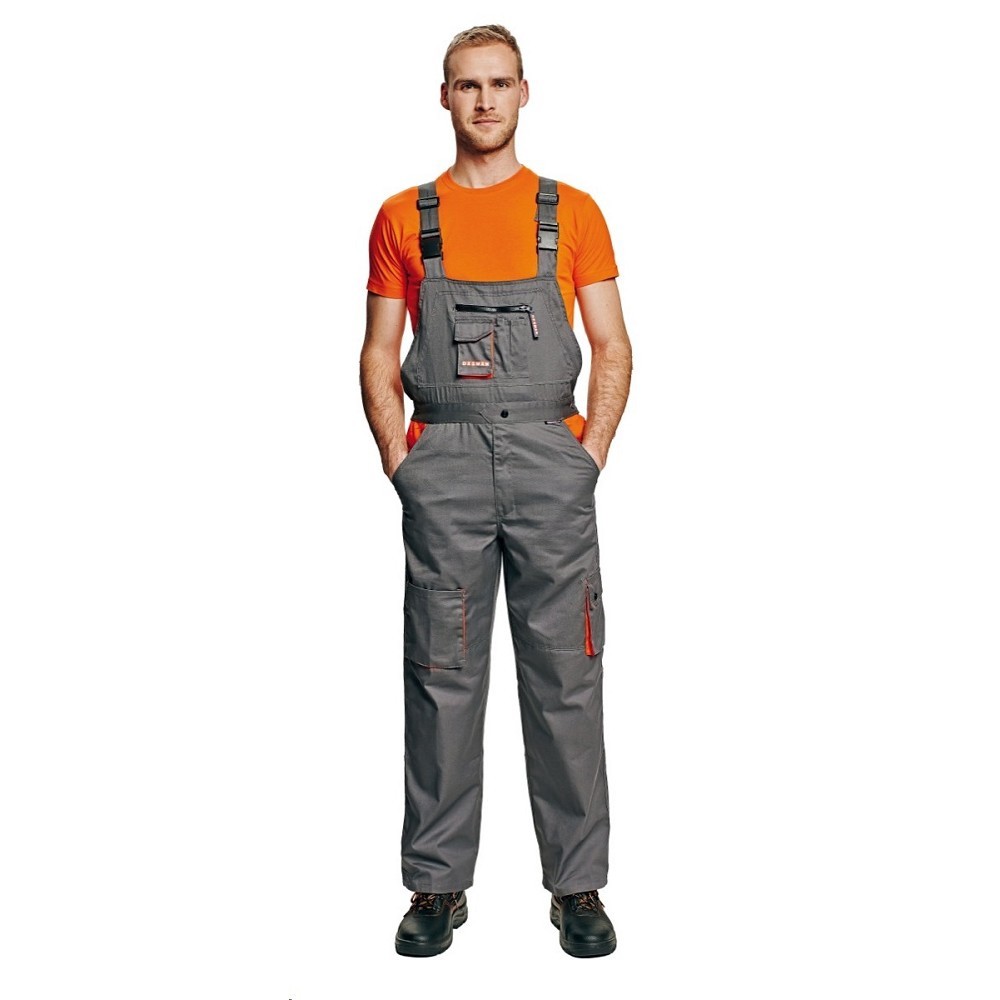 Montérkové kalhoty DESMAN pánské s laclem šedo-oranžové • montérkové kalhoty s laclem pohodlného střihu a funkčními detaily • široké elastické šle • pas v zadní části do gumy • Vlastnosti • šití okrajových vel. na zakáz • Velikost: 48 | 50 | 52 | 54 | 56 | 58 | 60 | 62 | 64 • Materiál: 35 % bavlna | 65 % polyester