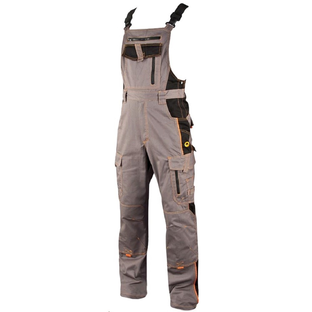 montérkové kalhoty s laclem z kvalitního směsového materiálu, zesílená kolena, kapsy na nákoleníky, kapsy a poutka na nářadí , pásek, reflexní doplňky, materiál: kepr 60% bavlna, 40% polyester 260g/m2, včetně hřebíčenky, barva: černo-šedá