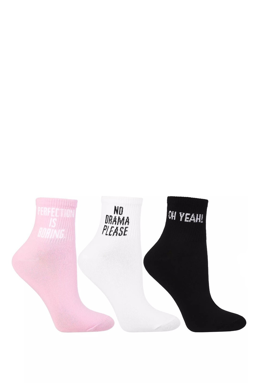 Dámské ponožky - z vysoce kvalitní bavlny - žebrovaný svršek zdobený nápisem - ideální pro každodenní styling - dokonale se přizpůsobí vašim nohám - zajišťují vysoký komfort nošení - k dispozici ve 3 barvách: černá, bílá, růžová - náhodný výběr Složení: 69 % bavlna, 28 % polyamid, 3 % elastan
