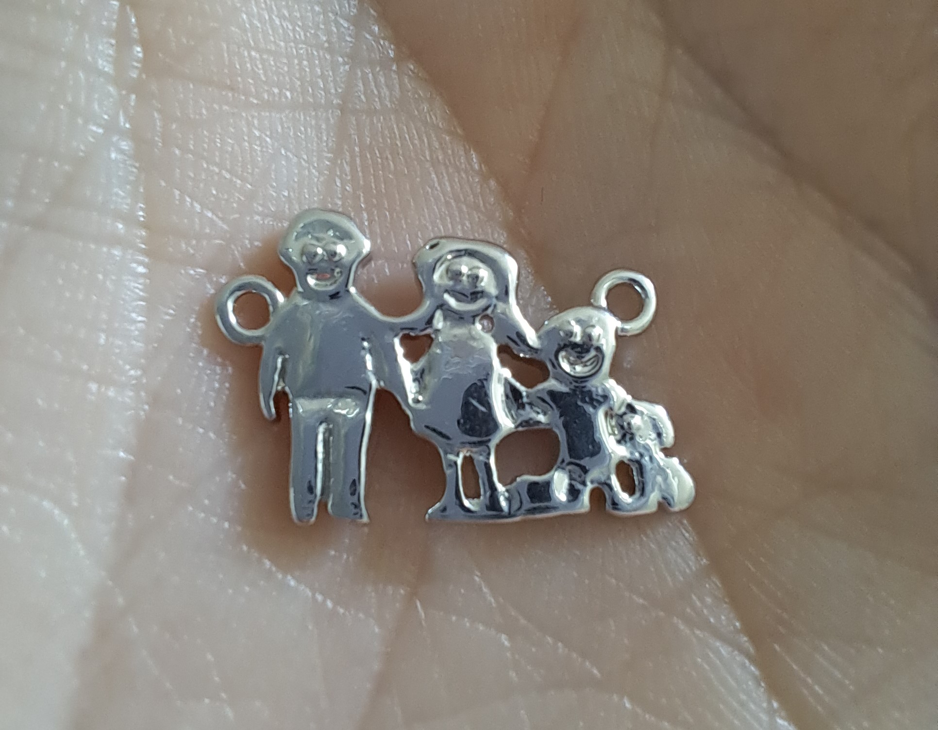 Mosazný mezidíl ve tvaru rodiny o výšce 17 ~ 18 mm, šířce 11 mm, hloubce 1 mm s velikostí průvleku 1 mm. Mezidíl nabízíme v platinovém provedení. Mezidíl ve tvaru členů rodiny – tatínek, maminka a chlapeček se psem. Mezidíl lze zajímavě kombinovat s korálky nebo jej můžete nechat vyniknout samostatně na návlekovém materiálu jako je například nylon, šňůra z hovězí kůže či bavlněná voskovaná šňůra. Mezidíl je vyroben z mosazi a neobsahuje kadmium, nikl ani olovo. Mezidíl prodáváme po jednom kusu.