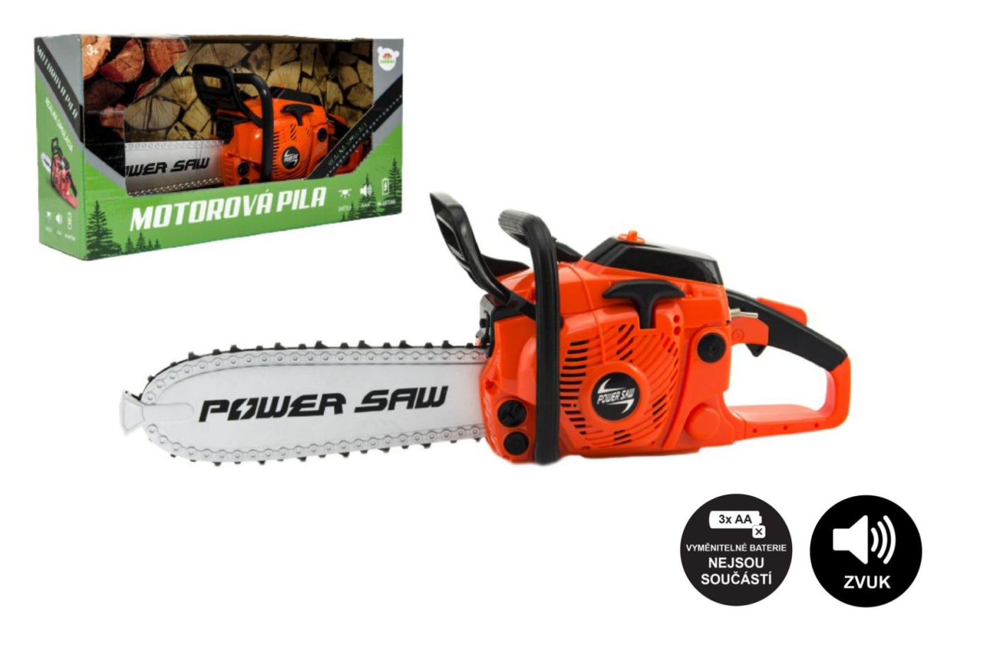 Při práci vydává realistické zvuky a světelné efekty jako skutečná pila při ořezávání stromů a větví. Nastartováním a přidáním plynu se roztočí řetěz, na baterie, v krabici.Rozměr pily: 41 cmVhodné od 3 let