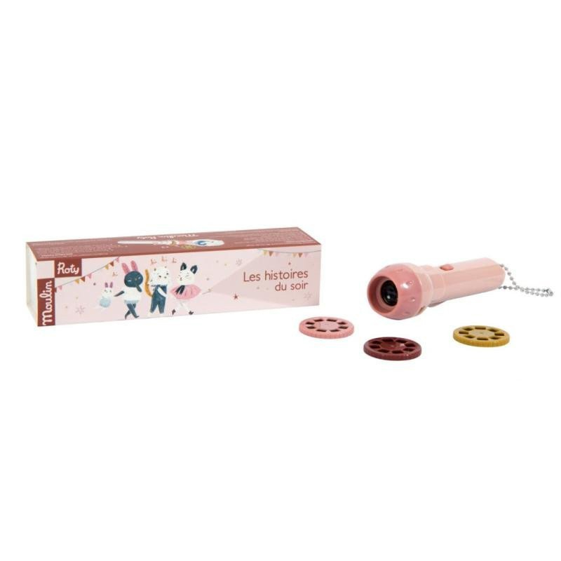 Nádherná zábava pro malé děti. Kapesní baterka s promítacími kotoučky, kterými si na zeď promítnete něžný příběh zvířátek. Obrázky se mění otáčením hlavy promítačky, pro zaostření použijte přední část baterky, pootočením zaostříte obraz. Podněcuje fantazii a mile naladí před usnutím.
