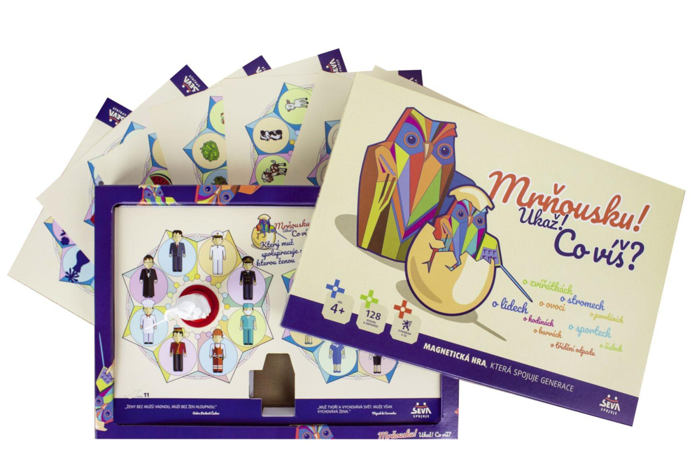 Chcete si vyzkoušet a prověrit vědomosti svých ratolestí zábavnou formou? Bude dítě chytřejší než moudrá sova při odpovědích typu... Víš kde bydlí pavouk? Jak vypadá mládě medvěda? Nebo jak vypadá meloun když se rozkrojí?..... Vědomostní hra obsahuje celkem 128 obrázkových otázek ze 16 okruhů. O zvířátkách, o stromech, o ovoci, o lidech, o barvách, o číslech, o sportech, o povoláních, o zelenině apod. Děti nepotřebují umět číst, aby si hru mohly zahrát, jelikož všechny otázky a úkoly jsou obrázkové. Hrát může jeden nebo více hráčů. Při hře si vyberete otázku. Pokud nebudete znát správnou odpověď, moudrá sova ti ji zodpoví. Účelem hry může být test vědomostí, soutěž o více správných odpovědí nebo přímo výuka odpovědí na dané otázky zábavnou formou. Jak na soutěž ..... Soutěž zahajuje nejmladší hráč. Vybere 1 otázku, odpoví a ověří správnost odpovědi (viz návod). Neodpoví-li, odpověď neověřuje – otázka zůstává dále ve hře. Stejně postupují i další účastníci hry – volit mohou pouze z neprobraných nebo nezodpovězených a neověřených otázek. Správná odpověď znamená zisk 1 bodu (detailně doslovná odpověď není podmínkou – rozhodující je věcná správnost odpovědi.Ocenit můžeme i částečnou odpověď). Další bod (prémiový) lze získat obsažnější odpovědí než zná moudrá sova. S udělením prémiového bodu vyslovují souhlas spoluhráči. Správnost takové odpovědi obhájíme citací z důvěryhodného pramene (učebnice, kniha, slovník, encyklopedie...). Pravidla hry je možné dále upřesňovat a rozvíjet.