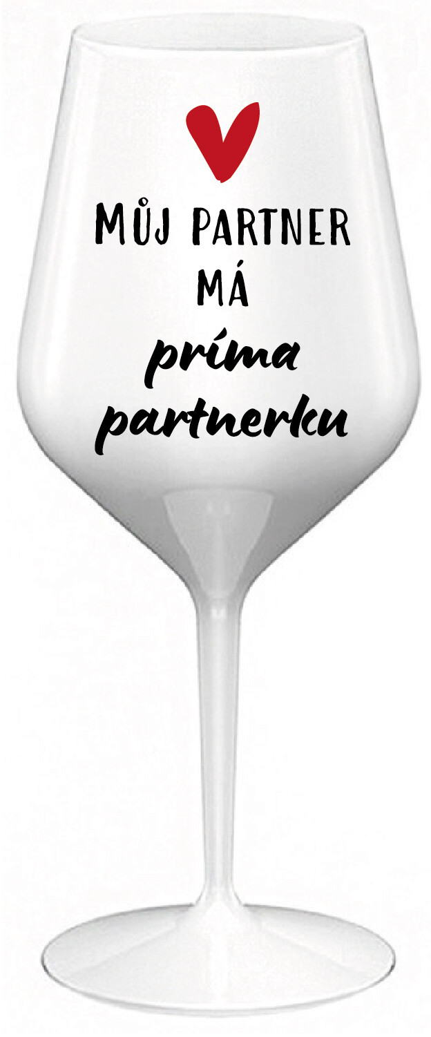 Nerozbitná bílá vinná sklenice s motivem MŮJ PARTNER MÁ PRIMA PARTNERKU je skvělá na zahradu, pláž, výlet, piknik a parádu udělá i při kempování. Jelikož je vyrobená z kvalitního polykarbonátu je de facto nerozbitná. Je to luxusní kousek, s nímž si víno můžete vychutnat prostě kdekoliv. Mají ergonomický tvar, který příjemně padne do ruky a protože je lehká, usnadňuje to její přenášení. Je snadno skladovatelná a lehce se čistí. Díky svému designu si s ní můžete vychutnat doopravdy kdekoliv bezproblémové pití výborného vína. Materiál PP. Vyrobené s láskou v ČR