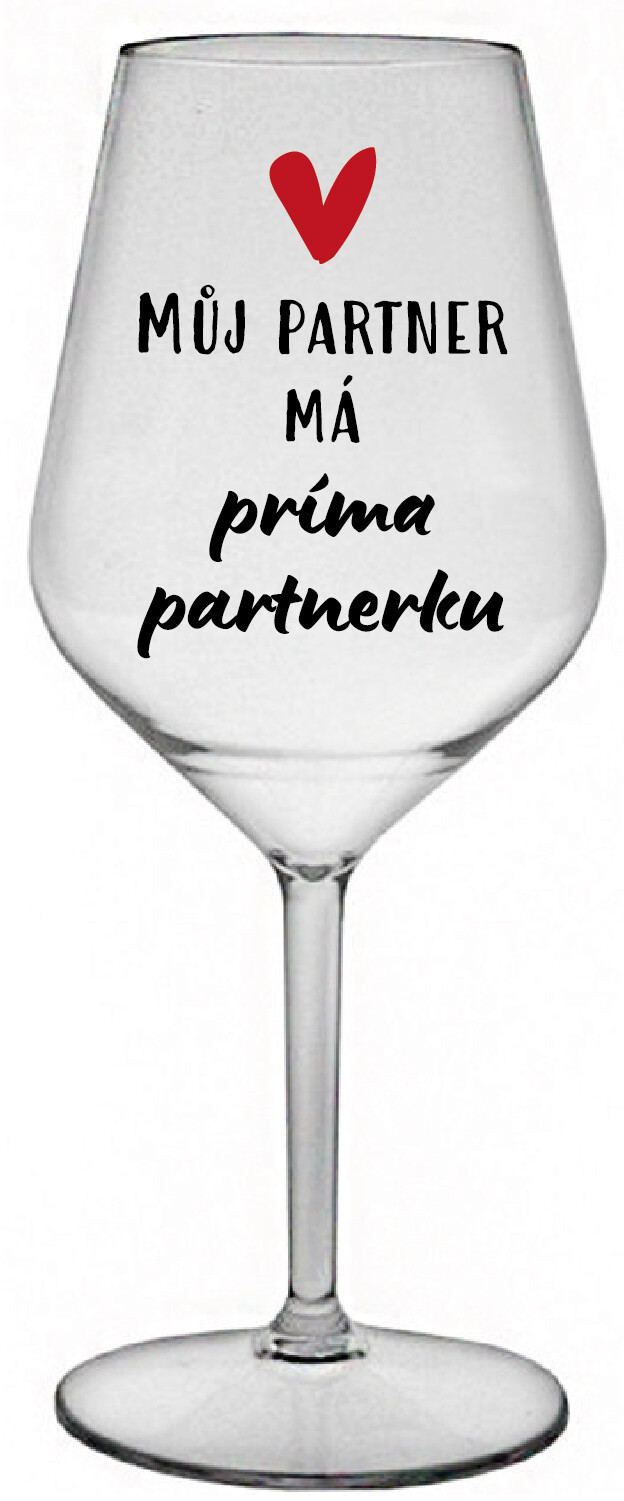 Nerozbitná čirá vinná sklenice s motivem MŮJ PARTNER MÁ PRIMA PARTNERKU je skvělá na zahradu, pláž, výlet, piknik a parádu udělá i při kempování. Jelikož je vyrobená z kvalitního polykarbonátu je de facto nerozbitná. Je to luxusní kousek, s nímž si víno můžete vychutnat prostě kdekoliv. Mají ergonomický tvar, který příjemně padne do ruky a protože je lehká, usnadňuje to její přenášení. Je snadno skladovatelná a lehce se čistí. Díky svému designu si s ní můžete vychutnat doopravdy kdekoliv bezproblémové pití výborného vína. Materiál PP. Vyrobené s láskou v ČR