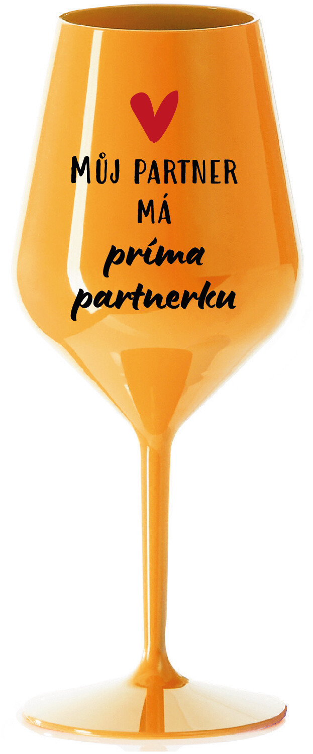 Nerozbitná oranžová vinná sklenice s motivem MŮJ PARTNER MÁ PRIMA PARTNERKU je skvělá na zahradu, pláž, výlet, piknik a parádu udělá i při kempování. Jelikož je vyrobená z kvalitního polykarbonátu je de facto nerozbitná. Je to luxusní kousek, s nímž si víno můžete vychutnat prostě kdekoliv. Mají ergonomický tvar, který příjemně padne do ruky a protože je lehká, usnadňuje to její přenášení. Je snadno skladovatelná a lehce se čistí. Díky svému designu si s ní můžete vychutnat doopravdy kdekoliv bezproblémové pití výborného vína. Materiál PP. Vyrobené s láskou v ČR