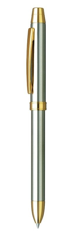 Dárkové multifunkční pero Penac Multisync kombinuje modré a červené kuličkové pero s mikrotužkou. Elegantní pero 3v1 má štíhlé kovové tělo s klasickým nadčasovým designem a lesklým stříbrným povrchem se zlatými prvky. Jednotlivé psací potřeby lze snadno volit díky kvalitnímu 360° otočnému mechanismu. Dokumentní inkoust Penac Mach s nízkou viskozitou zajišťuje plynulé a hladké psaní. Pero obsahuje pryž bez latexu a PVC a mikrotužku s tuhou 0,5 mm. Náplně včetně pryže jsou vyměnitelné. Dodáváno v papírové dárkové krabičce. Šíře stopy kuličkového pera: 0, 35 mm. Vyrobeno v Japonsku.