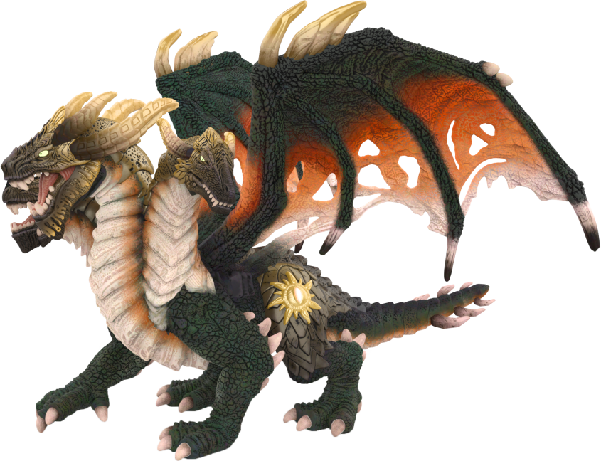 Figurka mýtického draka o velikosti cca 13 cm s krásně propracovanými detaily a v jasných barvách. Ponořte se do světa fantazie s těmito úžasnými, mýtickými draky. Tříhlavý ďábelský drak představuje chamtivost, zlo a aroganci. Drak má spoustu jedu a kudy projde, neroste žádná tráva, znečišťuje zemi. Místo, kde žije, je bizarní a nepochopitelné.