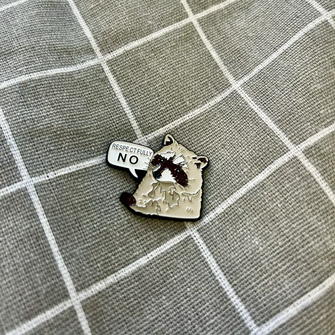 Mýval – „Respectfully NO“ / „Se vší úctou NE“\nVtipný smaltovaný odznáček s mývalem, který s kamenným výrazem říká „Respectfully NO“. Ideální pro všechny, kteří chtějí s humorem a nadsázkou vyjádřit své hranice. Skvěle kombinuje roztomilý design a ironii.\n📌 Kvalitní smaltovaný odznáček s jemnými detaily\n🦝 Motiv mývala s vtipnou bublinou „Respectfully NO“\n🎒 Hodí se na batoh, tašku, mikinu nebo klopu saka\n🎁 Skvělý dárek pro přátele, kteří milují humor a sarkasmus\nTento pin ti umožní dát jasně najevo svůj postoj – a přitom pobavit okolí.