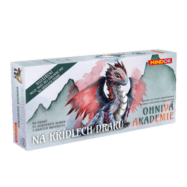 Na křídlech draků: Ohnivá akademie - rozšíření hry Na křídlech draků obsahuje novou desku Dračího bratrstva a upravené počítadlo kol s kostičkami zácviku. Staňte se drakologem a otevřete akademii pro dračí dorost! Rozšíření Na křídlech draků: Ohnivá akademie obsahuje: 80 karet draků 25 karet jeskyní 5 oboustranných desek Dračího bratrstva 7 oboustranných destiček úkolů 45 kostiček zácviku 7 upravených karet ze základní hry upravené počítadlo kol pořadač na karty