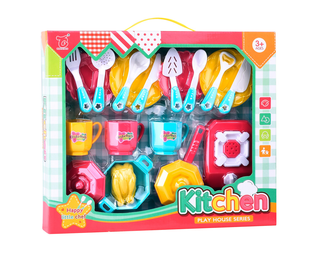 Sada nádobí pro malé hospodyňky. Součástí sady jsou talíře, příbory, hrníček, hrnec a další doplňky. Výrobek je vhodný pro děti od 3 let.