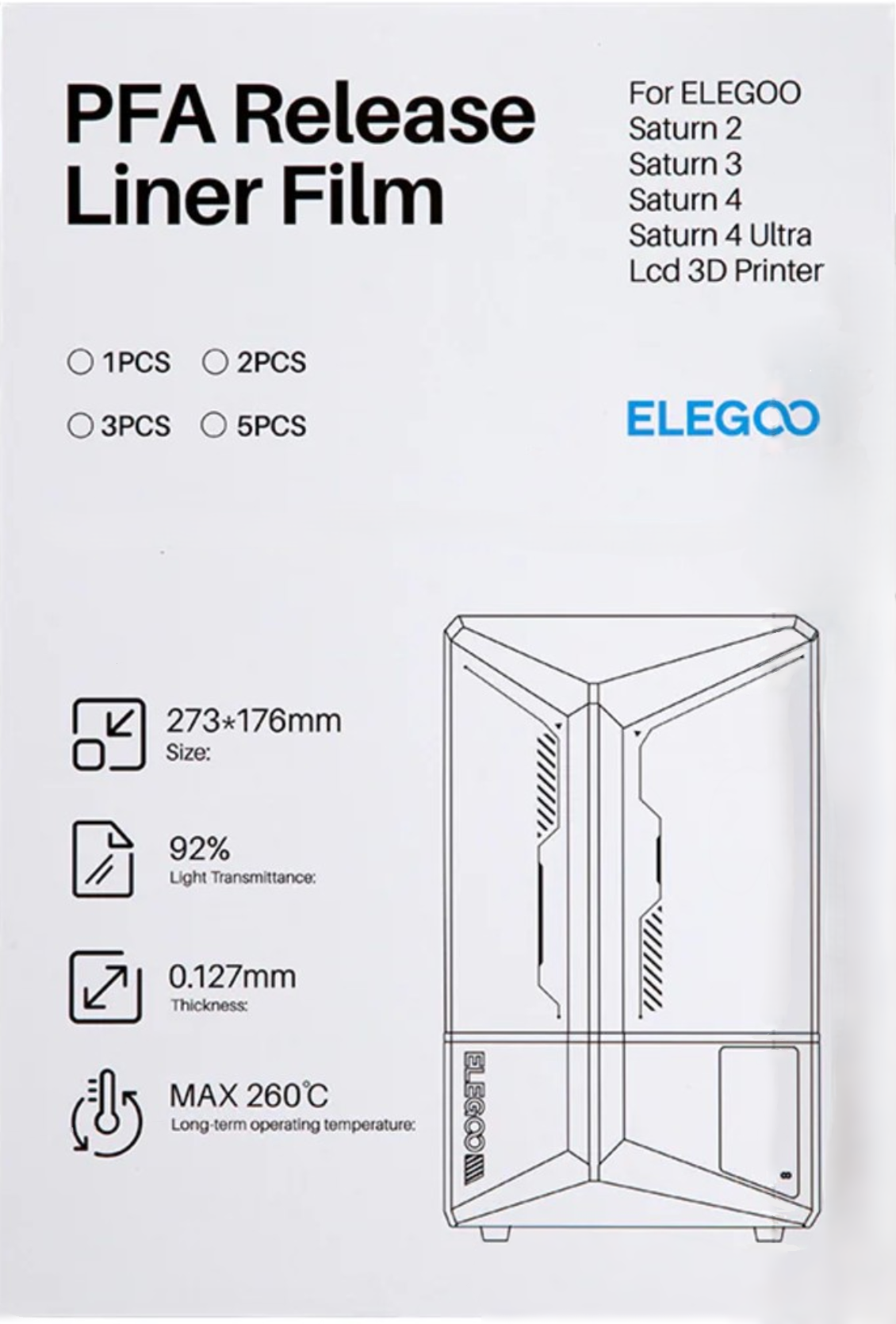 Náhradní PFA, neboli NFEP 2.0 folie pro MSLA 3D tiskárny. PFA fólie představují vylepšenou verzi klasických FEP fólií – nabízejí nižší přilnavost, vyšší optickou čistotu a delší životnost. S touto náhradní PFA fólií od značky Elegoo, navrženou speciálně pro resinové tiskárny řady Saturn, udržíte špičkovou kvalitu vašich výtisků. Klíčové vlastnosti: Tloušťka 0,1 mm Nižší separační síla – pro spolehlivější a snazší oddělování vrstev. Vysoká propustnost světla – pro detailní a rychlé vytvrzování. Odolnost vůči teplu, UV záření a chemikáliím Doporučení: Fólii pravidelně kontrolujte a vyměňte při ztrátě průhlednosti, nebo viditelném poškození. PFA fólie má vyšší životnost a přispívá k vyšší úspěšnosti tisku.