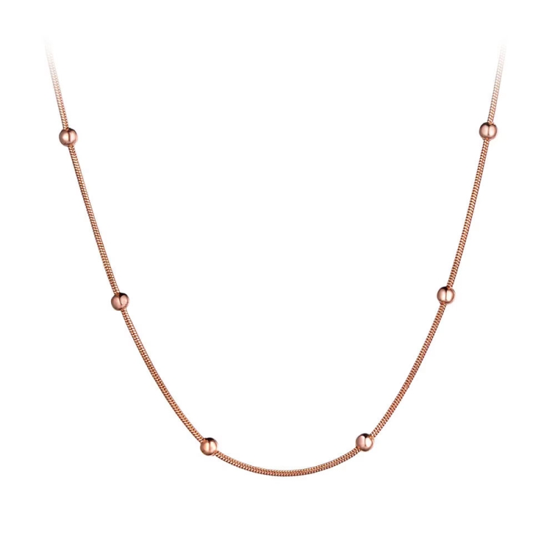 Jemný a elegantní náhrdelník, který v sobě spojuje decentní minimalismus s luxusním vzhledem. Drobné kuličkové detaily přidávají jemný akcent, který dodává šperku zajímavou dynamiku a zajišťuje jeho univerzální využití.Pozlacení 18k růžovým zlatem dodává náhrdelníku jemný, teplý tón, který dokonale ladí s různými styly oblečení. Hadí řetízek (herringbone) je známý svou hladkou, splývavou strukturou, díky které se krásně přizpůsobí pohybům nositelky. Kombinace lesklého povrchu s drobnými kuličkami vytváří harmonický celek, který působí moderně a zároveň nadčasově.Díky své jednoduchosti je tento náhrdelník ideální pro vrstvení s dalšími šperky nebo jako elegantní doplněk k večerním či ležérním outfitům. Jeho nadčasový design ocení ženy, které hledají šperk, jenž podtrhne jejich styl s nenápadnou noblesou. Skvěle se hodí jako dárek pro každou příležitost. 💡Tip: Pokud hledáš šperk, který bude vypadat skvěle jak samostatně, tak v kombinaci s dalšími doplňky, tento náhrdelník je ideální volbou. Jeho jemný design umožňuje snadné vrstvení s dalšími řetízky, čímž vytvoří moderní a osobitý vzhled. Skvěle vynikne například s kratším chokerem nebo delším jemným řetízkem.