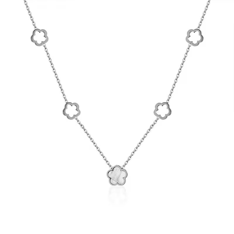 Náhrdelník z chirurgické oceli s jemnými květy je dokonalým spojením elegance a přírody. Květy rozprostřené po celé délce řetízku dodávají šperku hravý, ale přitom sofistikovaný vzhled, díky čemuž je ideální pro každodenní nošení i slavnostní příležitosti. Perleťový lesk přináší jemnost a nádech luxusu, který vynikne zejména na ženském dekoltu. Jeho jemný design je výjimečný svou univerzálností – dokáže oživit formální outfit i doladit jednoduché šaty na romantickou večeři. Chirurgická ocel zaručuje dlouhou životnost a odolnost proti poškození, díky čemuž si zachová svůj krásný vzhled po dlouhou dobu. Tento elegantní náhrdelník s květinovým motivem se stane skvělým doplňkem pro ženy, které preferují decentní a jemné šperky s nádechem přírody. S jeho pomocí jednoduše dosáhnete vyváženého vzhledu plného půvabu a stylu. 💡Tip: Noste tento náhrdelník s jednobarevným topem nebo šaty, které umožní vyniknout květinovým detailům. Výborně ladí s jemnými náušnicemi s perletí nebo minimalistickými prsteny.