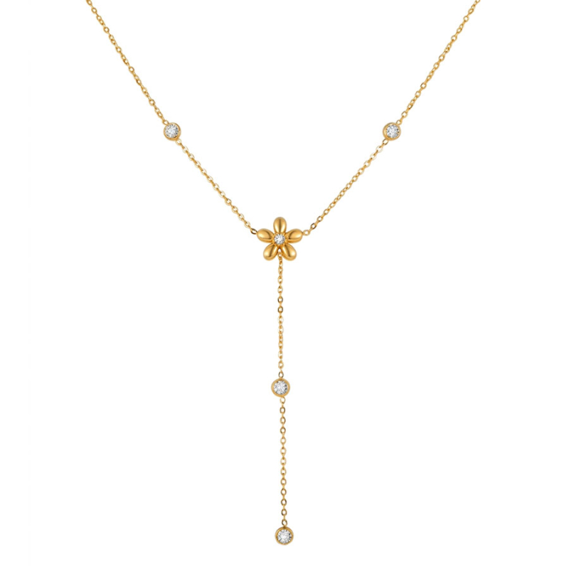Jemnost, která rozkvétá v každém detailu – tento pozlacený náhrdelník z chirurgické oceli zaujme na první pohled svým květinovým motivem a elegantně splývavým provedením. Centrální květ doplněný drobnými třpytivými zirkony přechází do vertikální linie, která opticky prodlužuje dekolt a dodává celku sofistikovanou lehkost. Výsledkem je šperk, jenž působí přirozeně, ženský a zároveň moderně.Minimalismus v letošní sezóně dominuje módním trendům, protože přináší čistotu, nadčasovost a snadnou kombinovatelnost s každodenním stylem. Tento náhrdelník je ideální volbou pro ženy, které chtějí jemný, ale promyšlený detail, který podtrhne jejich osobnost. Díky své subtilnosti nepůsobí rušivě, přesto zůstává nepřehlédnutelný.Proč si vybrat právě tento šperk? Nabízí harmonii mezi designem, kvalitou a elegancí. Chirurgická ocel zajišťuje dlouhou životnost a komfort při nošení, zatímco pozlacený povrch dodává náhrdelníku hřejivý, luxusní nádech. Perfektní volba pro jarní a letní měsíce, kdy vynikne na opálené pokožce i v lehkých outfitech. 💡 Tip: Tento náhrdelník krásně vynikne v kombinaci s hlubším výstřihem, kde jeho vertikální linie elegantně kopíruje siluetu dekoltu.