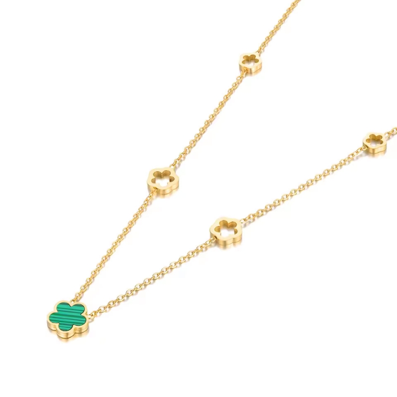 Jemný náhrdelník s květinovými motivy přináší do vašeho outfitu závan elegance a přírodní hravosti. Centrální květ s jemně zelenou výplní nádherně kontrastuje s lesklým 18k žlutým pozlacením, které dodává šperku luxusní vzhled. Náhrdelník je navržen z odolné chirurgické oceli, která zajišťuje dlouhou životnost a trvalý lesk. Jeho design s několika otevřenými květy rovnoměrně rozmístěnými po celé délce řetízku vytváří harmonickou kompozici, která působí vzdušně a lehce. Tento náhrdelník snadno doplní jak večerní šaty, tak i ležérní outfit. 💡Tip: Zkuste kombinaci s bílou halenkou nebo letními šaty, kde vynikne kontrast zeleného květu. Skvěle ladí také s jednoduchými prsteny nebo náramky.