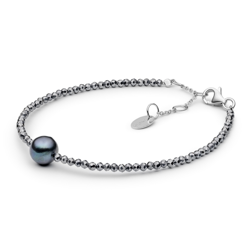 Pro všechny milovnice šperků vyrobených z drahých kamenů je v naší nabídce připravený jemný náramek z nejnovější kolekce Gaura Pearls. Náramek zdobí černá 8-9 mm sladkovodní perla, několik desítek vzácných 2-3 mm polodrahokamů Terahertz a stříbrné zapínání s prodlužovacím řetízkem ryzosti 925/1000 s kvalitní povrchovou úpravou rhodium. Náramek představuje spojení elegance a unikátnosti, jemnost a krása jsou jeho hlavní přednosti. Ozdobte se i vy tímto luxusním doplňkem a staňte se hvězdou společnosti. Délka náramku je 17 cm + 3 cm prodlužovací řetízek. V naší nabídce naleznete i náhrdelník ve stejném stylu a tím vytvoříte pěknou soupravu náramku a náhrdelníku. Terahertz je velmi silný ochranný kámen chránicí před zlem a veškerou negativitou. Perla je jedním z nejkrásnějších darů přírody! Po staletí si miliony žen volili přírodní perlové šperky, aby zdůraznili svou ženskost, krásu, půvab a šarm. Perly jsou symbolem krásy, dokonalosti a skromnosti, často nazývané „andělské slzy“. Zajišťují bezpečnost a chrání před selháním. Čistí pocity a odstraňují negativní emoce.