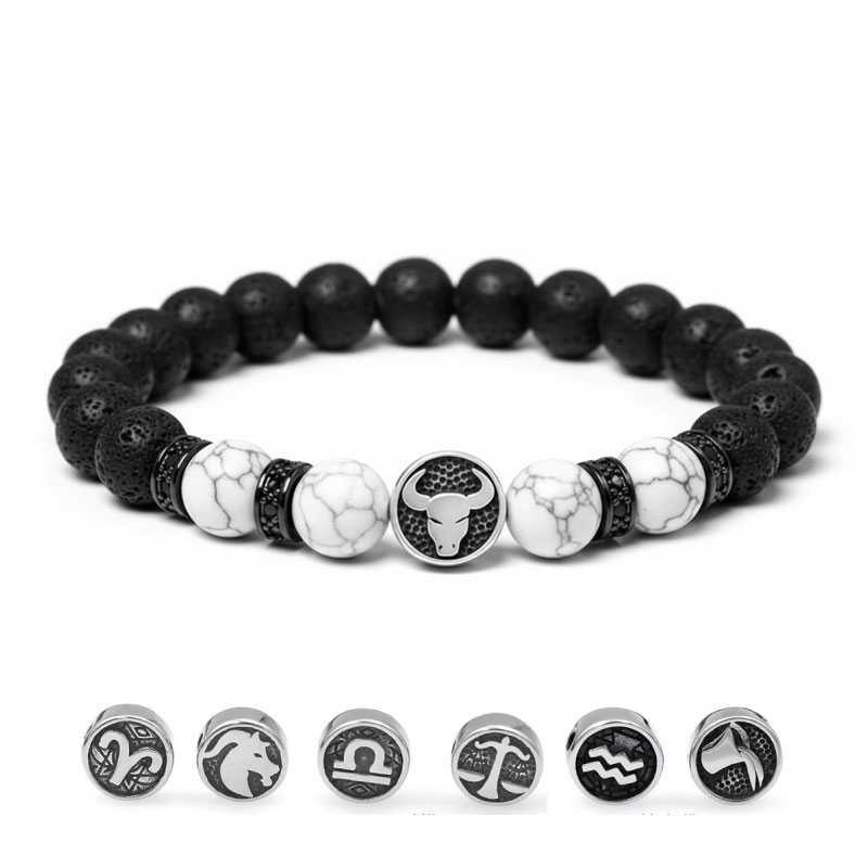 Stylový pánský náramek z přírodních kamenů je víc než jen doplněk – je to osobní šperk s hlubokým významem. Kombinace černého lávového kamene a bílého howlitu vytváří elegantní kontrast, který vynikne na každém zápěstí. Zvláštností tohoto náramku je ocelový korálek s motivem znamení zvěrokruhu, který si můžete zvolit dle svého znamení. Každý korálek je oboustranný a nabízí klasický symbol znamení a symbolickou ilustraci, což dělá z tohoto náramku ideální osobní dárek nejen pro vás, ale také pro vaše blízké.Howlit je považován za kámen klidu a rovnováhy, zatímco lávový kámen přináší sílu a uzemnění. Společně tvoří harmonické spojení, které podtrhuje mužskou energii, vnitřní stabilitu a vyrovnanost. Kovové ozdobné mezikroužky dodávají šperku jemně industriální a sofistikovaný charakter.Náramek je navlečen na pružném lanku, což zaručuje pohodlné nošení, a nabízíme jej ve třech délkách: 18 cm, 20 cm a 22 cm. Pokud byste potřebovali jinou velikost, neváhejte nás kontaktovat – rádi vám vyhovíme. Tento stylový a významný šperk bude skvělým doplňkem vašeho každodenního outfitu nebo dárkem pro milovanou osobu. 💡 Tip: Vyberte si znamení zvěrokruhu podle sebe nebo obdarovaného a vytvořte osobní šperk s výjimečnou symbolikou. Vhodné jako dárek pro bratra, partnera, kolegu nebo přítele – překvapí svou originalitou a stylovým provedením.