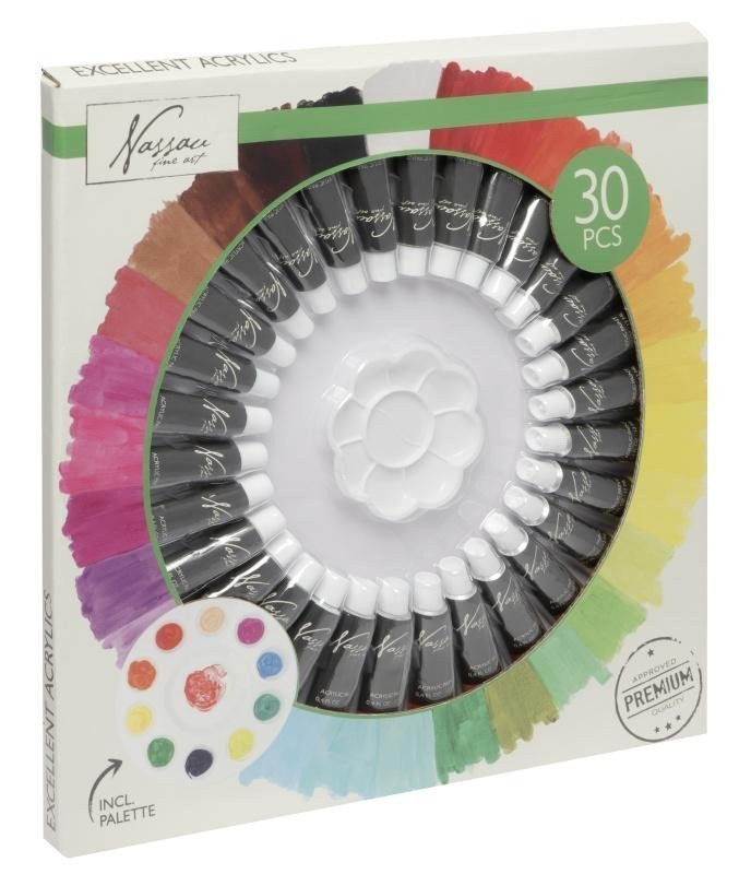 Pěkná sada akrylových barev 30 barev x 12 ml + paleta. S 30 různými barvami si můžete vyzkoušet umění malby, než se vrhnete do většího množství barvy. Ideální pro začátečníky i zkušené, kteří ocení velký výběr barev. Může být použit k malování na několik různých povrchů, jako je dřevo, papír, karton a plátno.