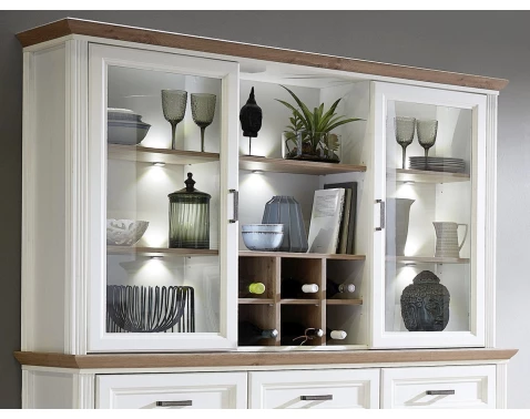 Nástavná vitrína s přihrádkami a osvětlením v bělené pinie s dubovým dřevodekorem z kolekce Jasmin pro útulný venkovský styl a rustikální interiér.