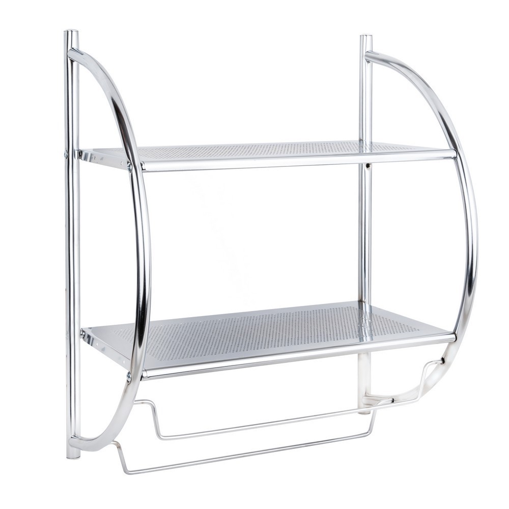 Populární nástěnná police. Pochromovaný kov, ze kterého je vyroben, zajišťuje odolnost a estetický vzhled. Má 2 police a dvě tyče na zavěšení ručníků. Nástěnná police vyžaduje montáž svépomocí.