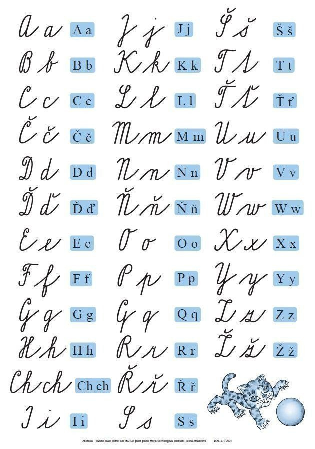Oboustranná tabule vázaného psacího písma přináší písmena v abecedním pořadí. Na výběr je varianta malého psacího z s kličkou nebo s obloučkem.