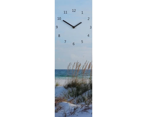 Vertikální nástěnné hodiny 20x60 cm s přírodním motivem písečné pláže a moře se hodí do moderního obývacího pokoje, ložnice i kuchyně.