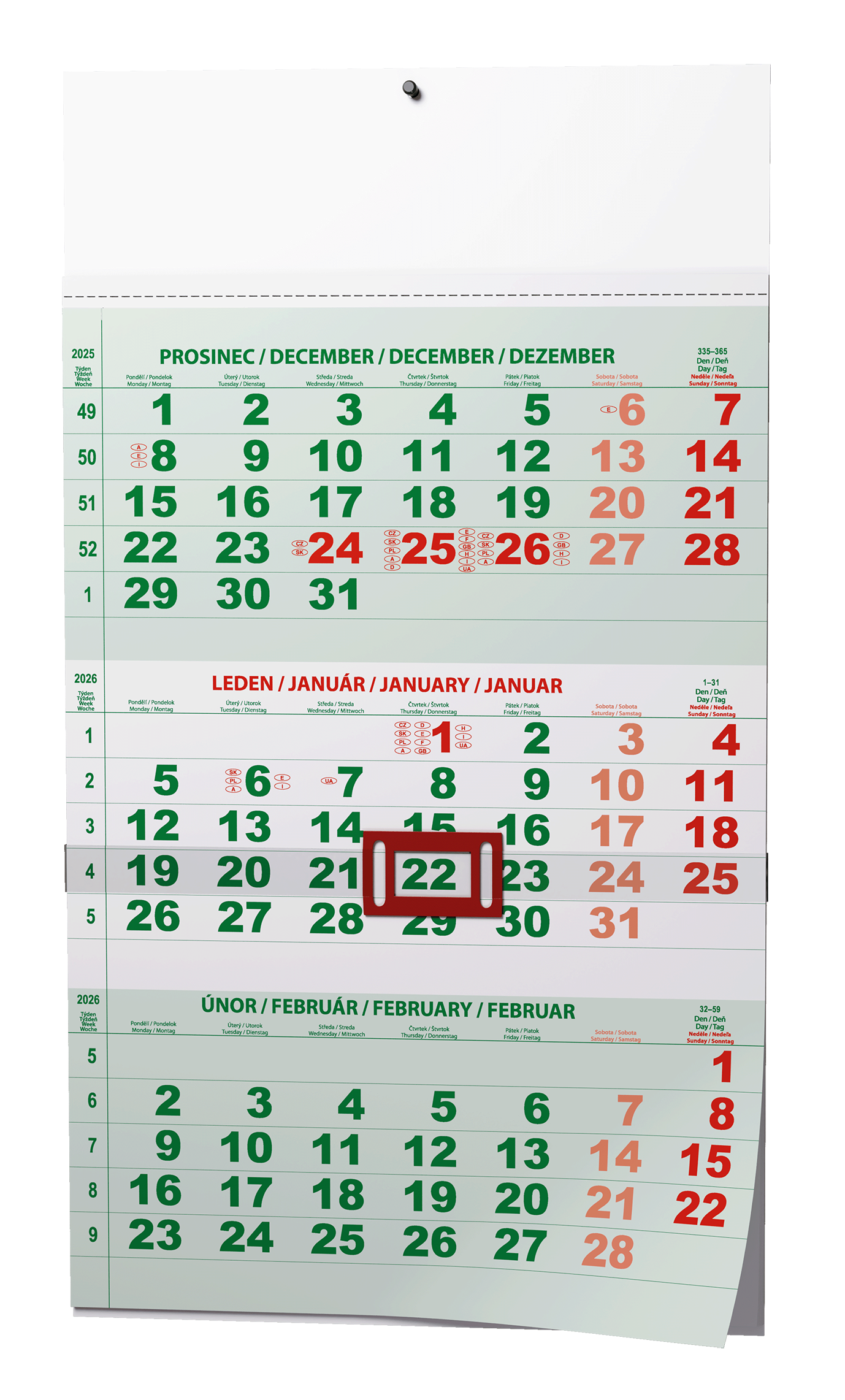 Praktický nástěnný kalendář s tříměsíčním kalendáriem a posuvným jezdcem vhodný do Vaší kanceláře. papír: ofset, 100 g/m2 karton je z kvalitní bílé lepenky, součástí je posuvný jezdec z laminovaného papíru horní karton je přišitý ke kalendáriu skobičkami Možnosti potisku kalendáře Kalendář je možné nechat individuálně potisknout. Potisk se provádí různými způsoby dle složitosti a barevnosti loga či obrázku. Používá se digitální tisk, sítotisk, stejně jako nalepení potisku. Možné jsou i další úpravy jako třeba výměna titulní strany nebo vložení kalendáře do papírového kartonu, který pak může být také potištěný. Základní potisk se obvykle provádí pro minimální počet 50 ks kalendářů. V případě zájmu o jakoukoliv úpravu nás kontaktujte na e-mail zobac@papirnictvioskarek.cz nebo telefonicky na tel. 608 939 293. Rádi s Vámi probereme veškeré možnosti. Zakupte produkt Nástěnný kalendář 2026 Baloušek - Tříměsíční (s mezinárodními svátky) - zelený z kategorie Kalendáře, diáře | Nástěnné kalendáře 2026 | Tříměsíční a jednolisté nástěnné kalendáře 2026 od výrobce Baloušek za cenu 62 Kč.