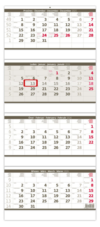 Čtyřměsíční skládaný nástěnný kalendář na rok 2026 od tradičního a oblíbeného výrobce Helma 365. Formát kalendáře: 31,5 x 74 cm Kalendárium: české čtyřměsíční jmenné + svátky vybraných evropských států (CZ / SK / A / B / D / F / H / CH / I / PL / RUS / UKR) Rozsah kalendáře: 4 x 12 listů Prostor pro přítisk: 31,5 x 3,5 cm Složený kalendář: 31,5 x 18,5 cm Vejde se do obálky B4 Možnosti potisku kalendáře Kalendář je možné nechat individuálně potisknout. Potisk se provádí různými způsoby dle složitosti a barevnosti loga či obrázku. Používá se digitální tisk, sítotisk, stejně jako nalepení potisku. Možné jsou i další úpravy jako třeba výměna titulní strany nebo vložení kalendáře do papírového kartonu, který pak může být také potištěný. Základní potisk se obvykle provádí pro minimální počet 50 ks kalendářů. V případě zájmu o jakoukoliv úpravu nás kontaktujte na e-mail zobac@papirnictvioskarek.cz nebo telefonicky na tel. 608 939 293. Rádi s Vámi probereme veškeré možnosti. Zakupte produkt Nástěnný kalendář 2026 Helma - Čtyřměsíční skládaný šedý z kategorie Kalendáře, diáře | Nástěnné kalendáře 2026 | Tříměsíční a jednolisté nástěnné kalendáře 2026 od výrobce Helma 365 za cenu 125 Kč.