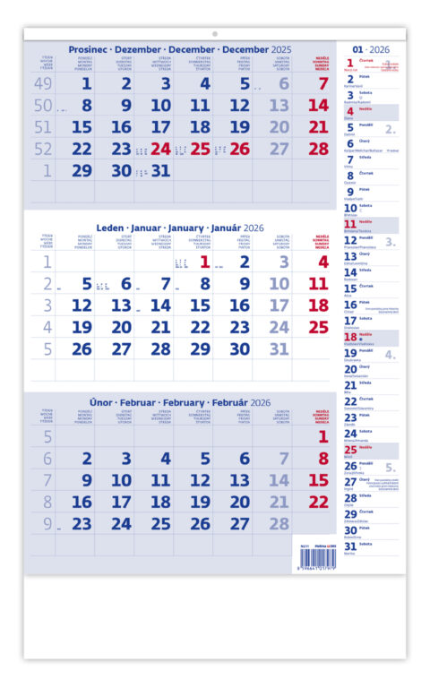 Tříměsíční nástěnný kalendář na rok 2026 od tradičního a oblíbeného výrobce Helma 365. Formát kalendáře: 31,5 x 45 cm Kalendárium: české a slovenské tříměsíční + svátky vybraných evropských států (CZ / SK / A / B / D / F / H / CH / I / PL / RUS / UKR) Rozsah kalendáře: 12 listů Prostor pro přítisk: 31,5 x 7 cm Možnosti potisku kalendáře Kalendář je možné nechat individuálně potisknout. Potisk se provádí různými způsoby dle složitosti a barevnosti loga či obrázku. Používá se digitální tisk, sítotisk, stejně jako nalepení potisku. Možné jsou i další úpravy jako třeba výměna titulní strany nebo vložení kalendáře do papírového kartonu, který pak může být také potištěný. Základní potisk se obvykle provádí pro minimální počet 50 ks kalendářů. V případě zájmu o jakoukoliv úpravu nás kontaktujte na e-mail zobac@papirnictvioskarek.cz nebo telefonicky na tel. 608 939 293. Rádi s Vámi probereme veškeré možnosti. Zakupte produkt Nástěnný kalendář 2026 Helma - Tříměsíční modrý s poznámkami z kategorie Kalendáře, diáře | Nástěnné kalendáře 2026 | Tříměsíční a jednolisté nástěnné kalendáře 2026 od výrobce Helma 365 za cenu 72 Kč.