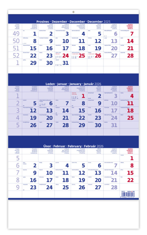Tříměsíční nástěnný kalendář na rok 2026 od tradičního a oblíbeného výrobce Helma 365. Formát kalendáře: 31,5 x 45 cm Kalendárium: české a slovenské tříměsíční + svátky vybraných evropských států (CZ / SK / A / B / D / F / H / CH / I / PL / RUS / UKR) Rozsah kalendáře: 12 listů Prostor pro přítisk: 31,5 x 7 cm Možnosti potisku kalendáře Kalendář je možné nechat individuálně potisknout. Potisk se provádí různými způsoby dle složitosti a barevnosti loga či obrázku. Používá se digitální tisk, sítotisk, stejně jako nalepení potisku. Možné jsou i další úpravy jako třeba výměna titulní strany nebo vložení kalendáře do papírového kartonu, který pak může být také potištěný. Základní potisk se obvykle provádí pro minimální počet 50 ks kalendářů. V případě zájmu o jakoukoliv úpravu nás kontaktujte na e-mail zobac@papirnictvioskarek.cz nebo telefonicky na tel. 608 939 293. Rádi s Vámi probereme veškeré možnosti. Zakupte produkt Nástěnný kalendář 2026 Helma - Tříměsíční modrý z kategorie Kalendáře, diáře | Nástěnné kalendáře 2026 | Tříměsíční a jednolisté nástěnné kalendáře 2026 od výrobce Helma 365 za cenu 72 Kč.