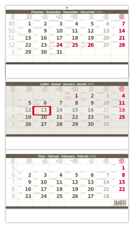 Tříměsíční skládaný nástěnný kalendář na rok 2026 od tradičního a oblíbeného výrobce Helma 365. Formát kalendáře: 31,5 x 45 cm Kalendárium: české a slovenské tříměsíční + svátky vybraných evropských států (CZ / SK / A / B / D / F / H / CH / I / PL / RUS / UKR) Rozsah kalendáře: 12 listů Prostor pro přítisk: 31,5 x 7 cm Možnosti potisku kalendáře Kalendář je možné nechat individuálně potisknout. Potisk se provádí různými způsoby dle složitosti a barevnosti loga či obrázku. Používá se digitální tisk, sítotisk, stejně jako nalepení potisku. Možné jsou i další úpravy jako třeba výměna titulní strany nebo vložení kalendáře do papírového kartonu, který pak může být také potištěný. Základní potisk se obvykle provádí pro minimální počet 50 ks kalendářů. V případě zájmu o jakoukoliv úpravu nás kontaktujte na e-mail zobac@papirnictvioskarek.cz nebo telefonicky na tel. 608 939 293. Rádi s Vámi probereme veškeré možnosti. Zakupte produkt Nástěnný kalendář 2026 Helma - Tříměsíční skládaný šedý z kategorie Kalendáře, diáře | Nástěnné kalendáře 2026 | Tříměsíční a jednolisté nástěnné kalendáře 2026 od výrobce Helma 365 za cenu 103 Kč.