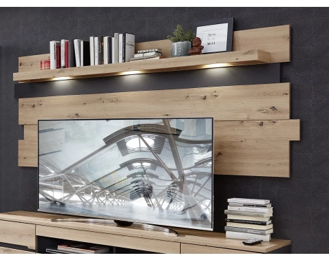 Nástěnný panel s osvětlením z programu Memphis – moderní nábytek v kontrastní kombinaci matný grafit s útulným dřevodekorem dub artisan.