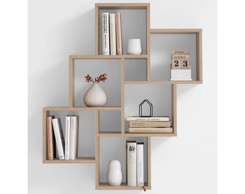 Nástěnný regál v dekoru dub sonoma má zajímavě členitou konstrukci, která obsahuje celkem 8 přihrádek o dvou různých velikostech. Tento praktický regál prakticky poslouží na knížky, dekorace nebo jakékoliv drobné předměty.